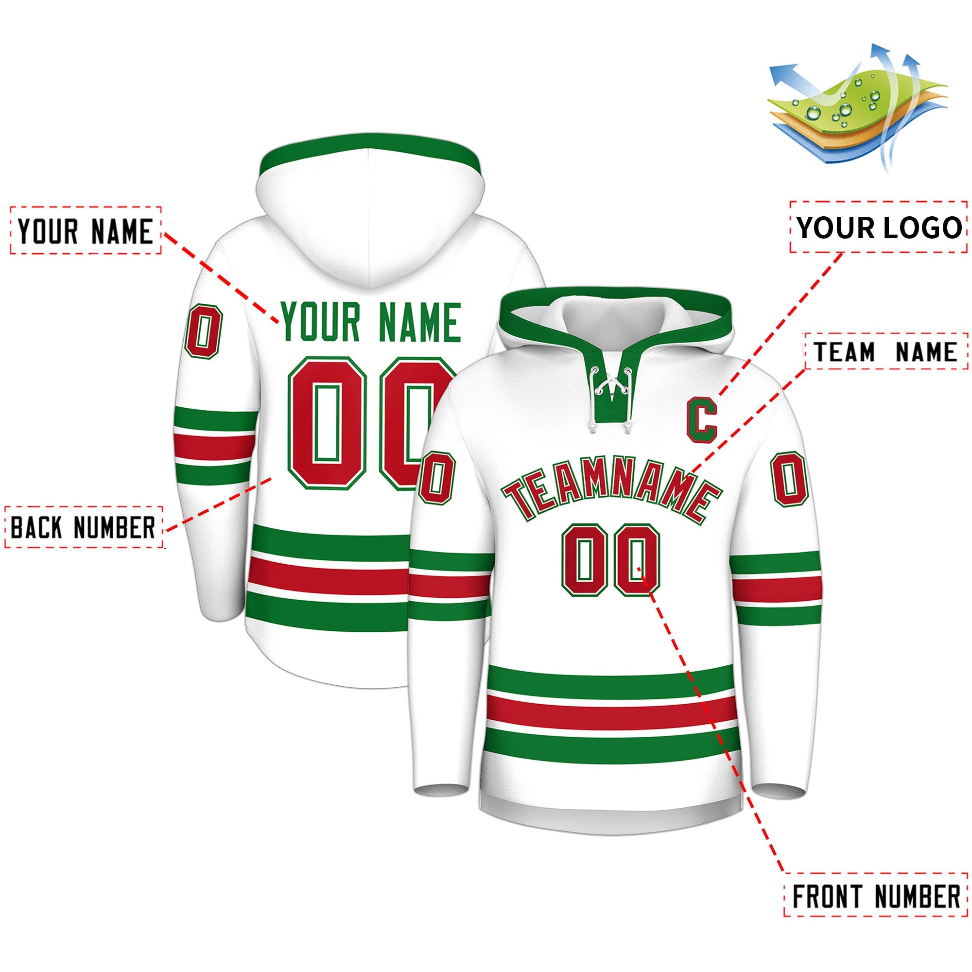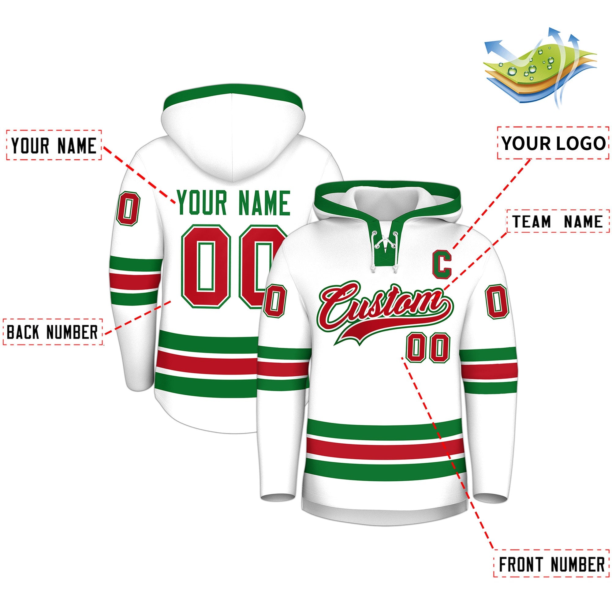 Custom White Kelly Green Classic Style Wrinkle-Resistant Lace-Up Neck Hockey Hoodie Jersey