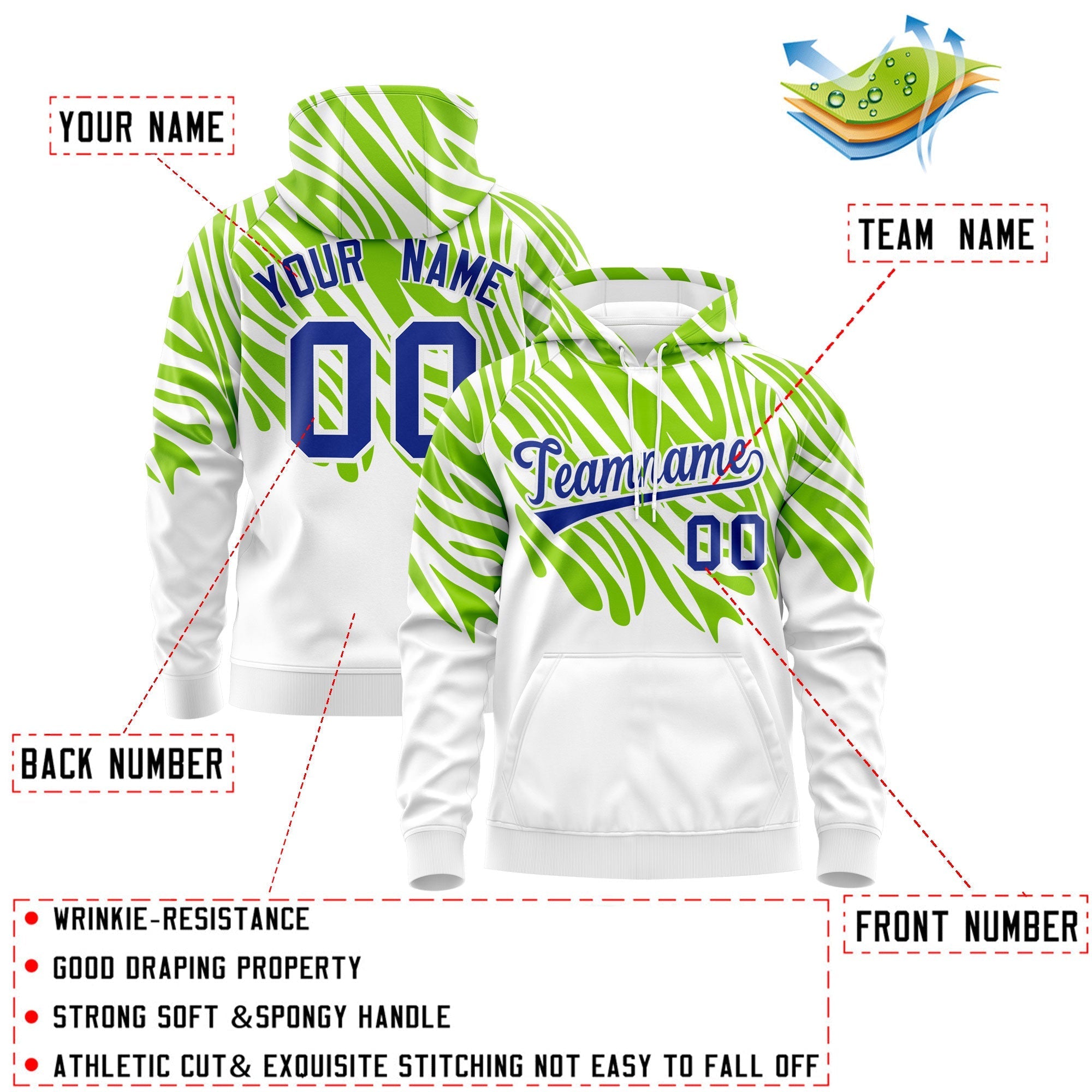 Custom Neon Green White Royal Blue Leopard Print Pullover Sweatshirt Hoodie