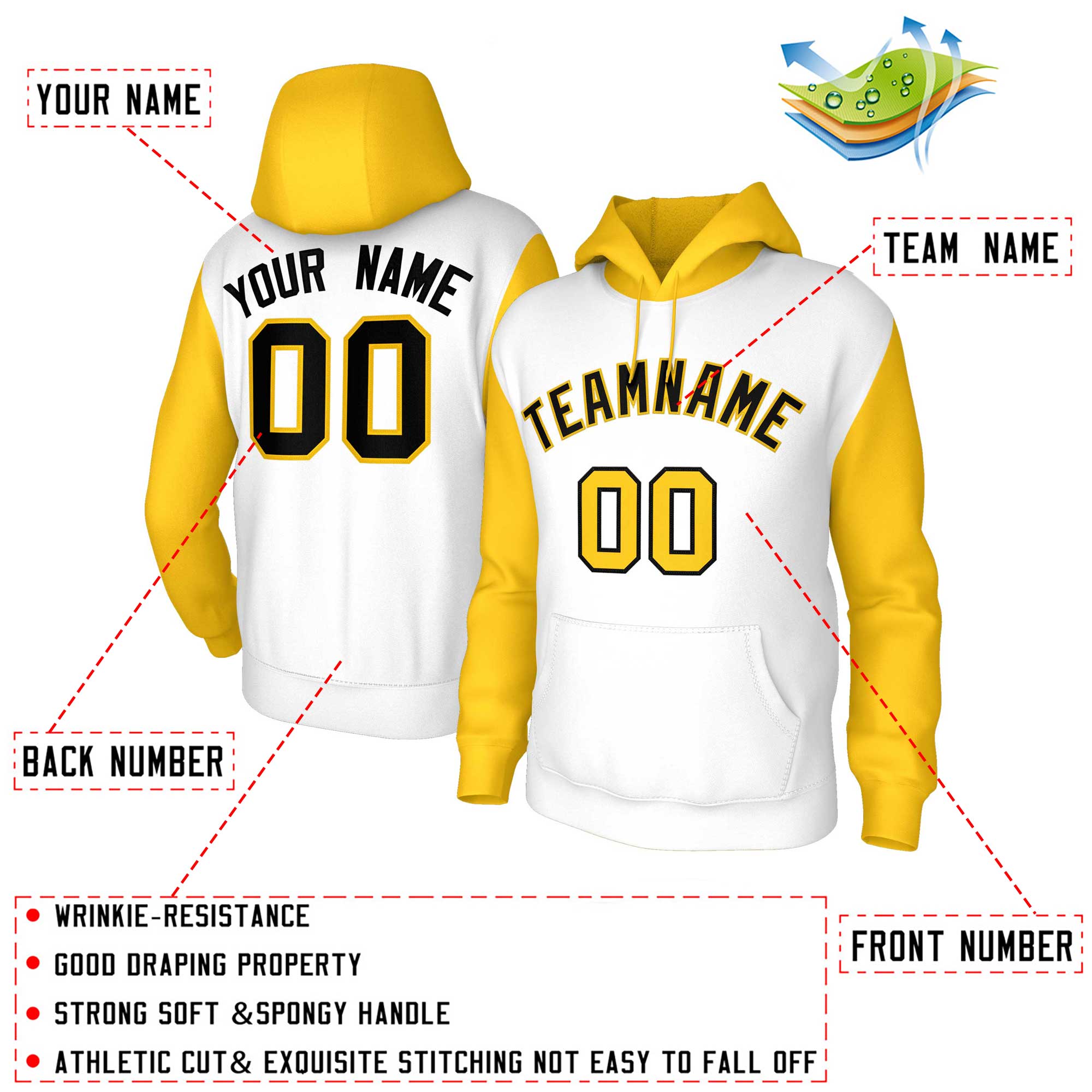Custom White Black-Gold Raglan Sleeves Stitched Sportwear Pullover Hoodie