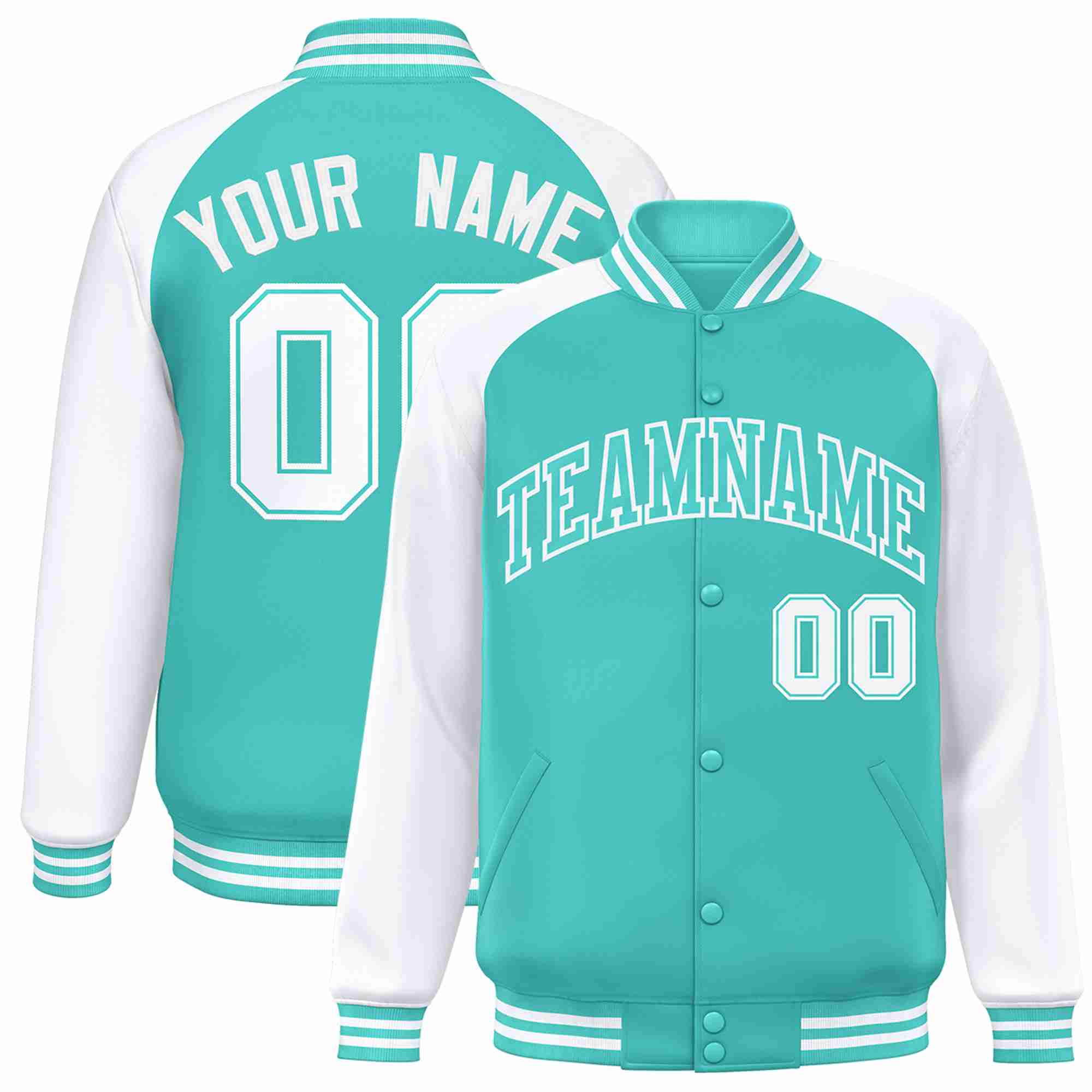 Custom Aqua White Raglan Sleeves Varsity Full-Snap Letterman Jacket