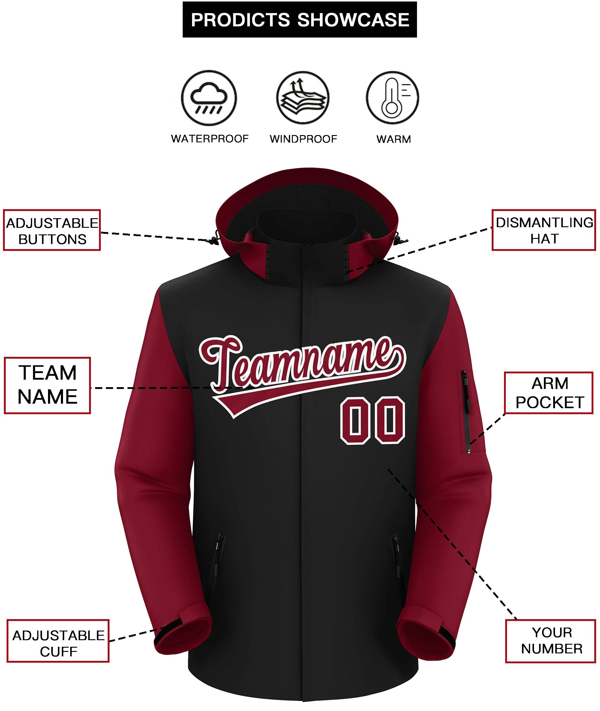 Custom Black Crimson-White Raglan Sleeves Waterproof Jacket