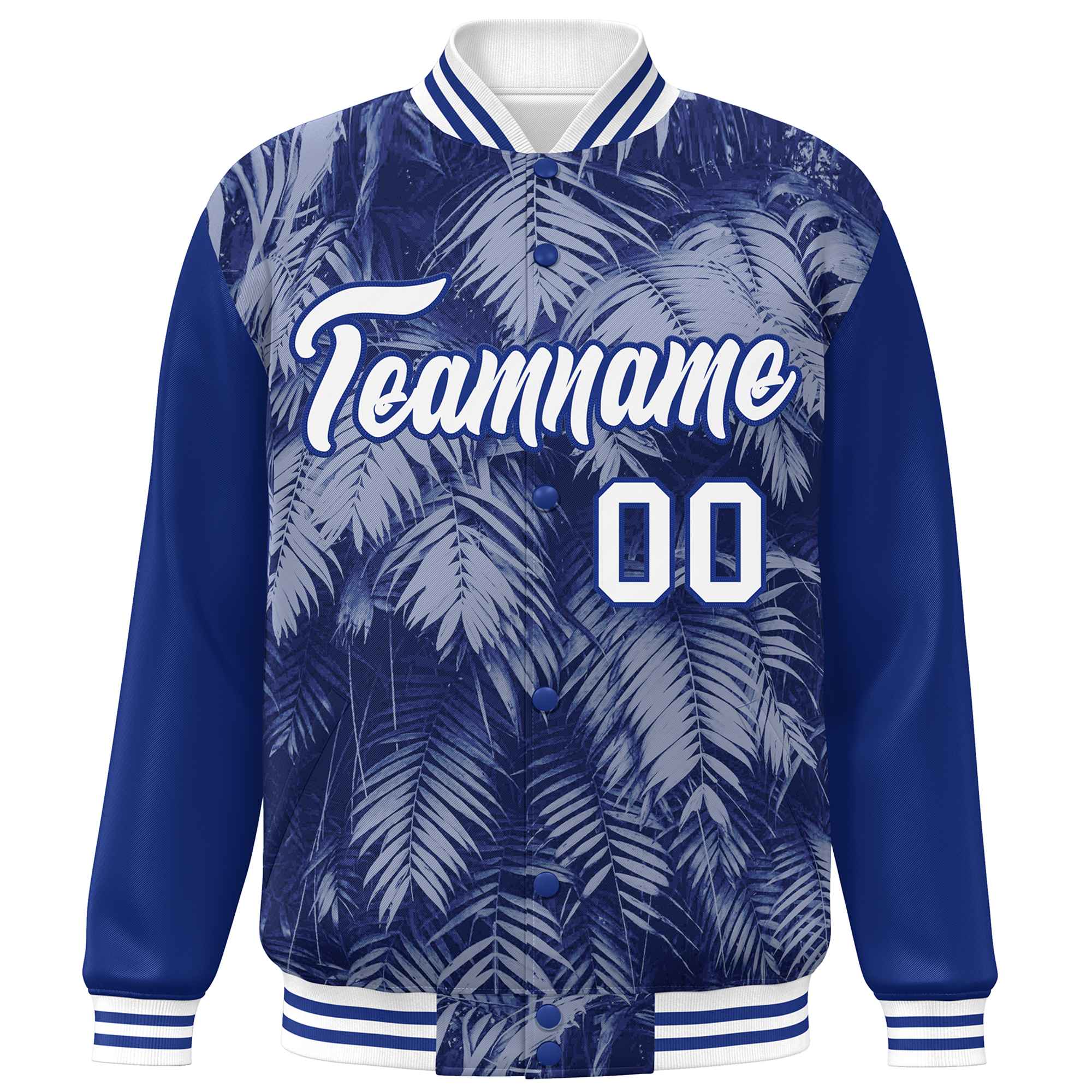 Custom Royal White-Navy Maple Leaf Raglan Sleeves Bomber Graffiti Pattern Varsity Jacket