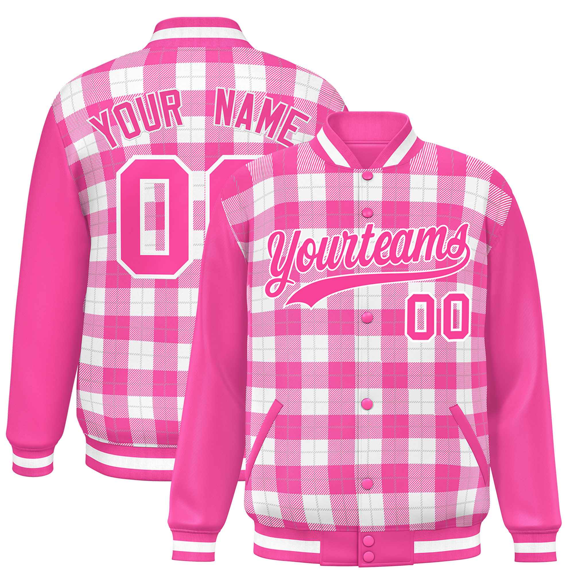 Custom White Pink-Gray Varsity Full-Snap Plaid Pattern Letterman Baseball Jacket