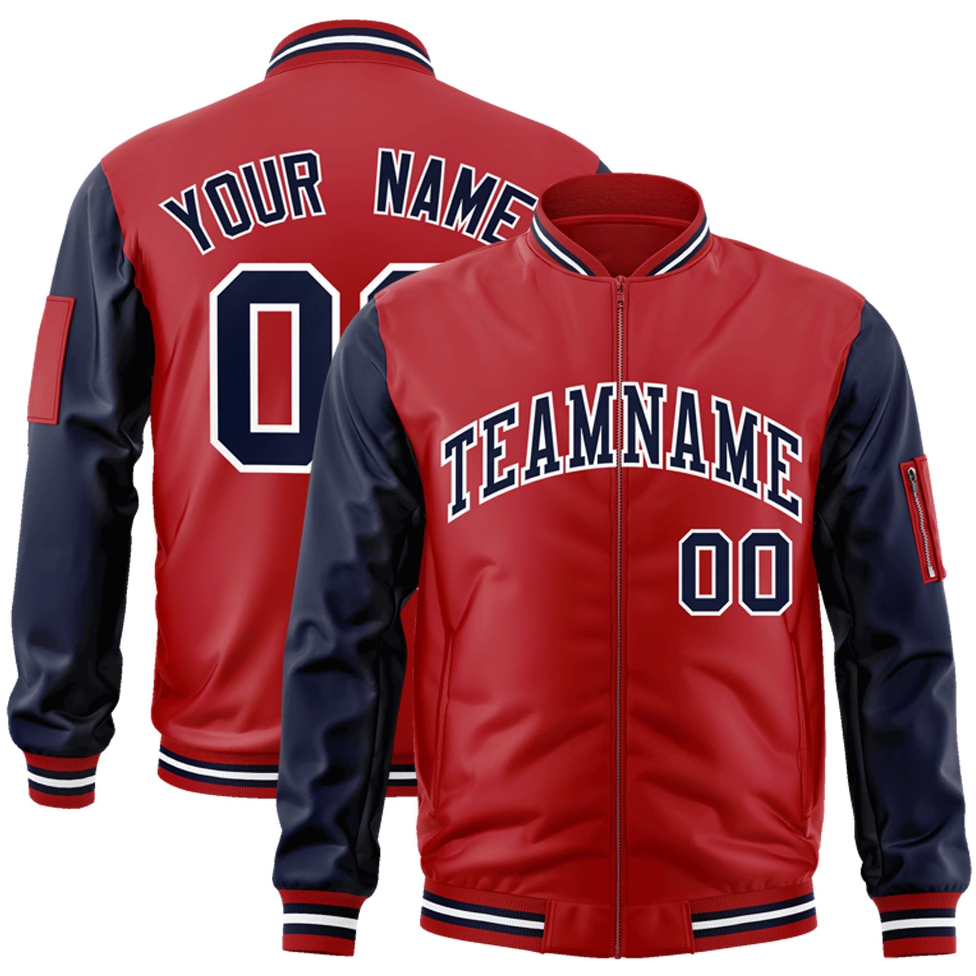 Custom Red Navy-White Varsity Full-Zip Raglan Sleeves Letterman Bomber Jacket