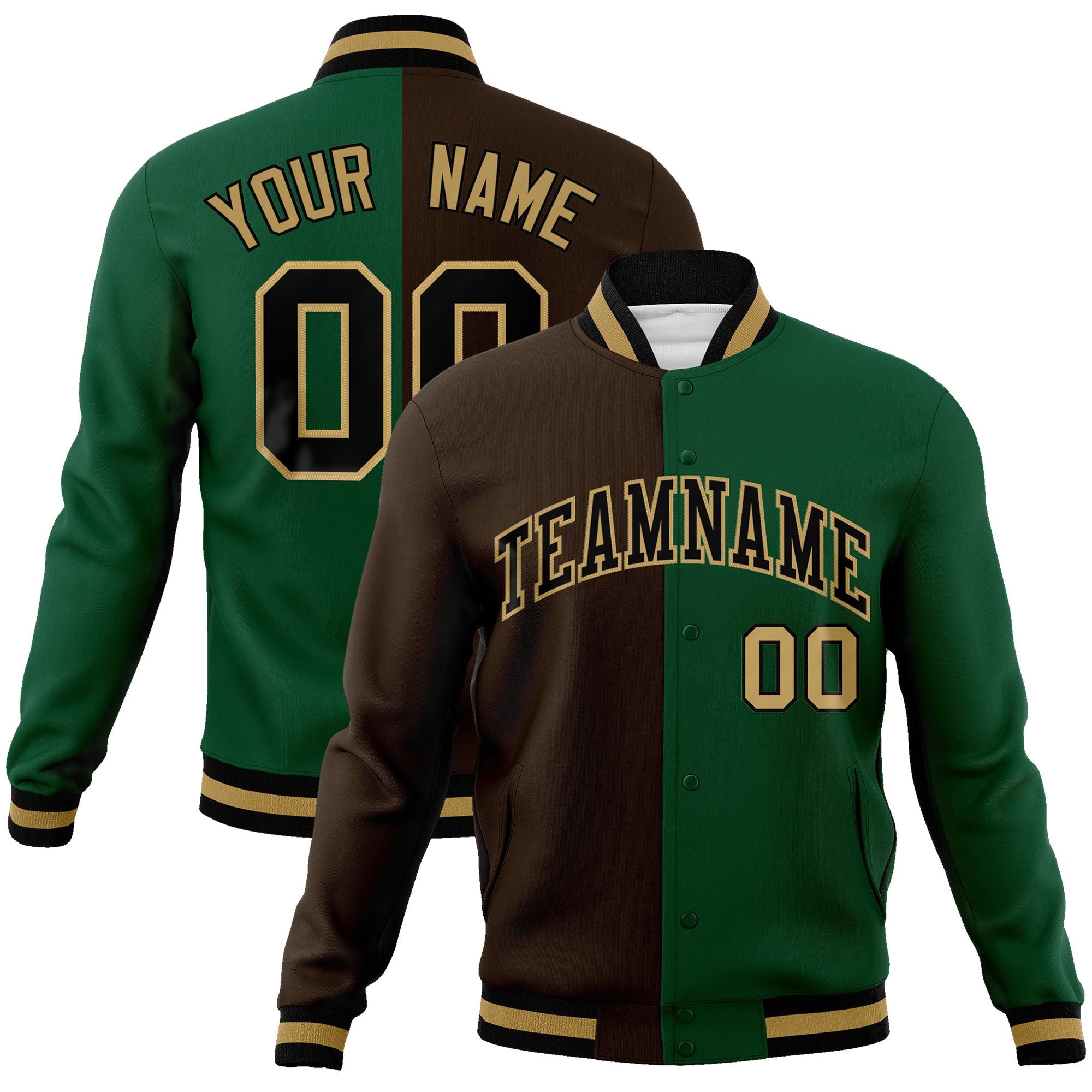 Custom Brown Green-Black Varsity Full-Snap Letterman Two Tone Split Fashion Jacket